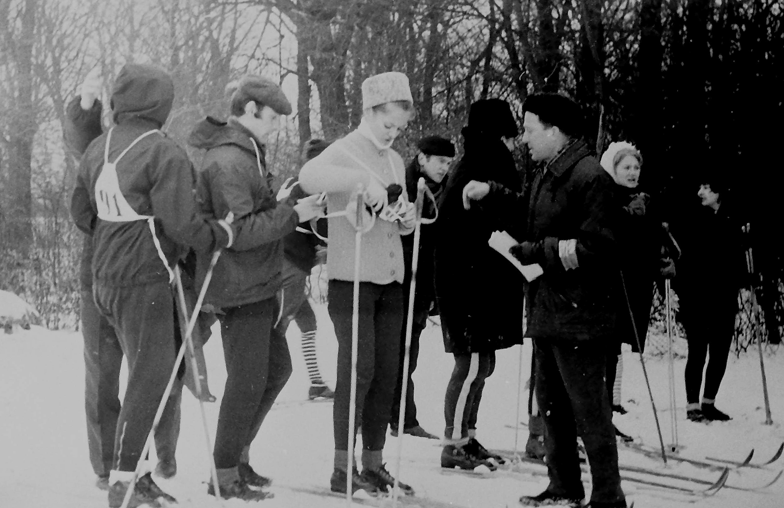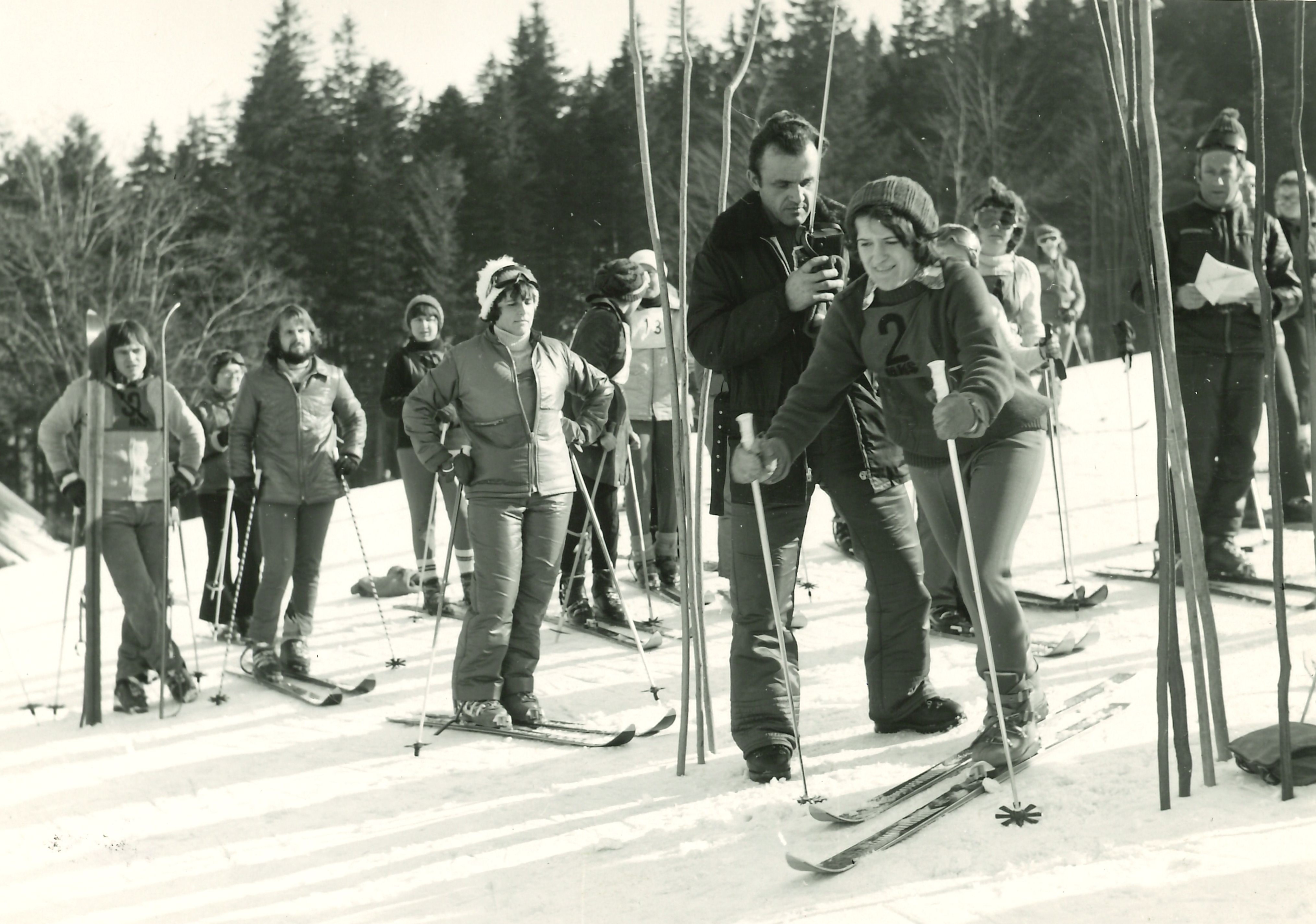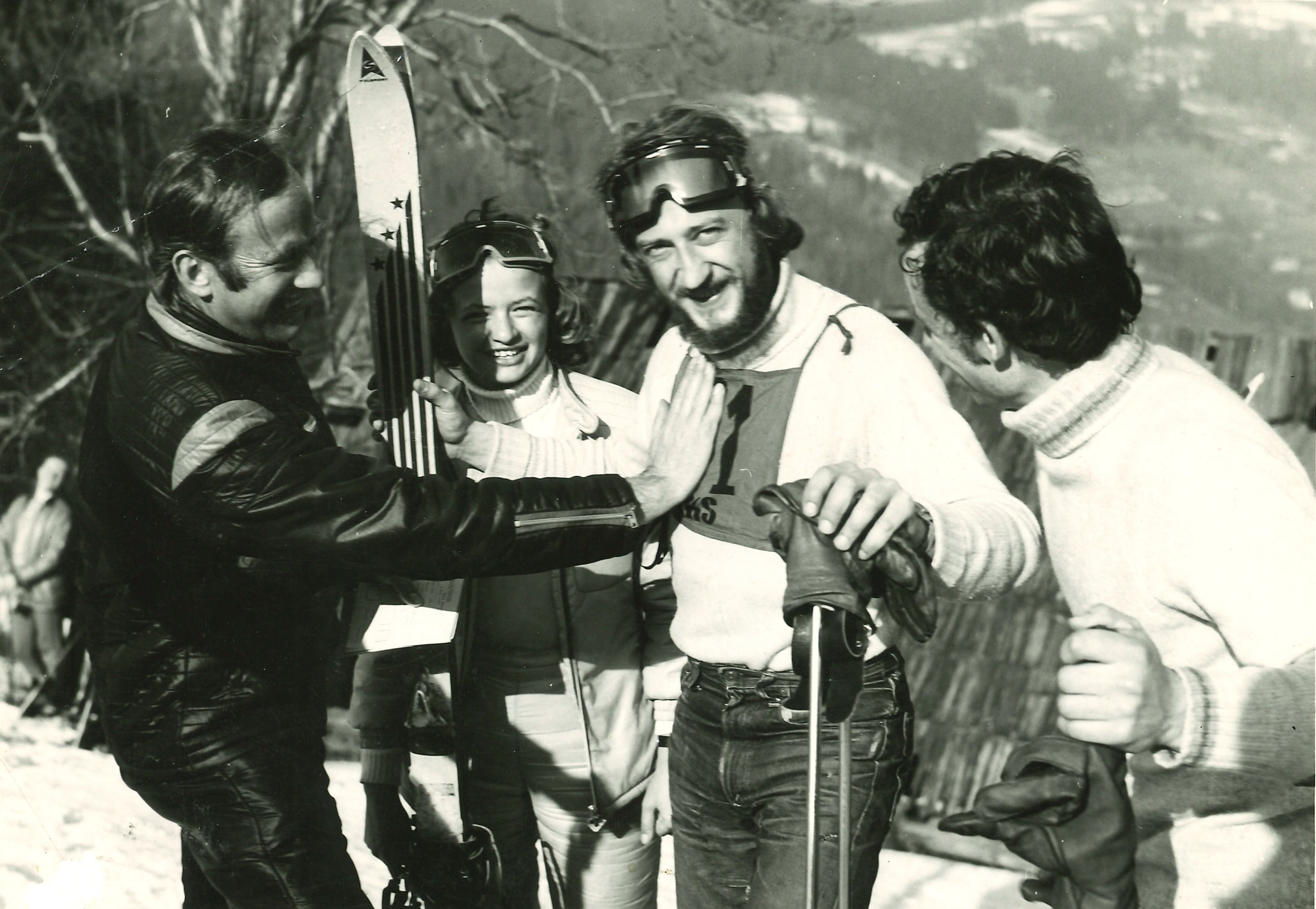 Zawody narciarskie w Szczyrku. Pierwszy z prawej Jerzy Mac, 1976 r.